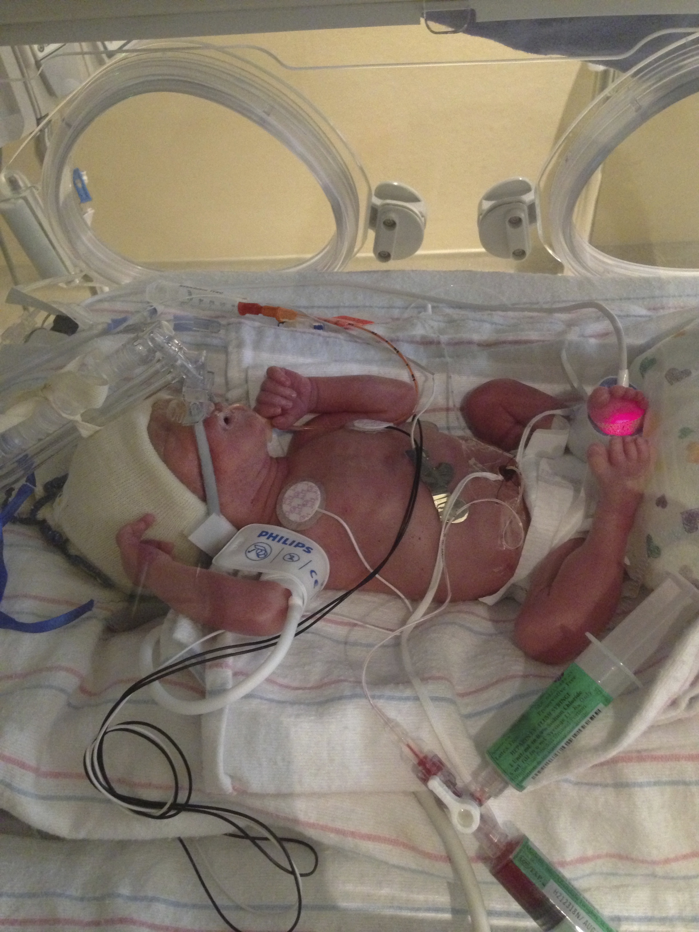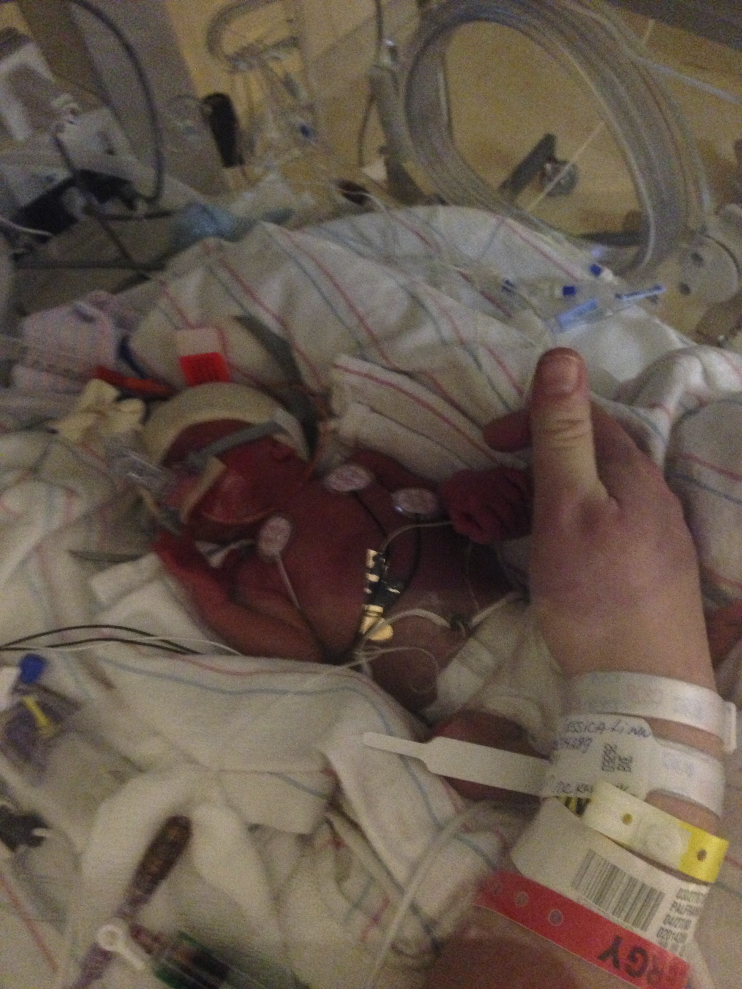 With a normal pregnancy and normal c-section the doctor would hold the baby up, get it slightly cleaned off and passed immediately to mom or dad. When they are tiny there is no holding them up and once they go to the NICU, hours pass before mom can visit. After all, the spinal has to wear off before you can feel you legs, and then they won’t let you sit up for another couple of hours. The nurses told me it was common for women not to head to the NICU for 12-18 hours after delivery.